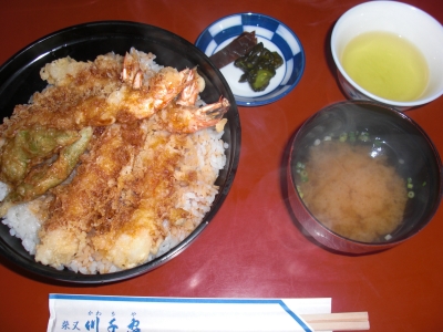 参道では、お昼に「えび天重」を頼みました。見た目は「えび天丼」?