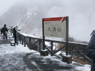 かなりガスっていて、折角の景観が見れず、雪も積もっていて頂上は断念、黒たまごとお土産買って帰りました。